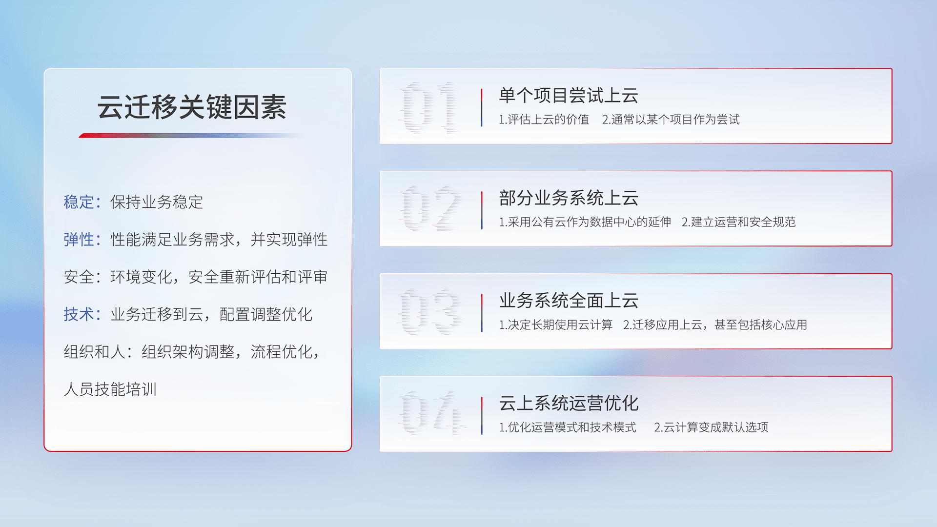 结合实际业务,,,,从规划设计、、云平台选型、、、云原生改造、、、、数据迁移、、、集成交付,,,迁移全过程为客户识别最佳上云路径,,做好风险识别管理,,设计网络架构、、、身份权限、、、安全审计合规、、操作审计、、、、日志审计、、、、监控告警策略、、、、多站点容灾设计等,,,,对云上基础设施进行整体规划,,,,提升IT治理水平,,,,以满足弹性、、高可用、、、高性能的需求。。
