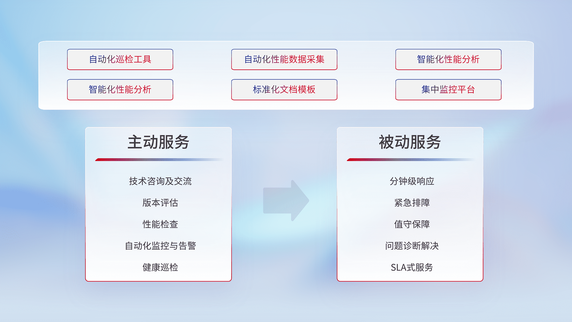 智能化工具和标准化文档,,,保障服务质量,,,提供主动服务(包含技术咨询、、、版本评估、、、、性能检查、、、、自动化监控与告警、、、健康巡检)和被动服务包含(分钟级响应、、、、紧急排障、、、、值守保障、、、问题诊断解决、、SLA服务)。。