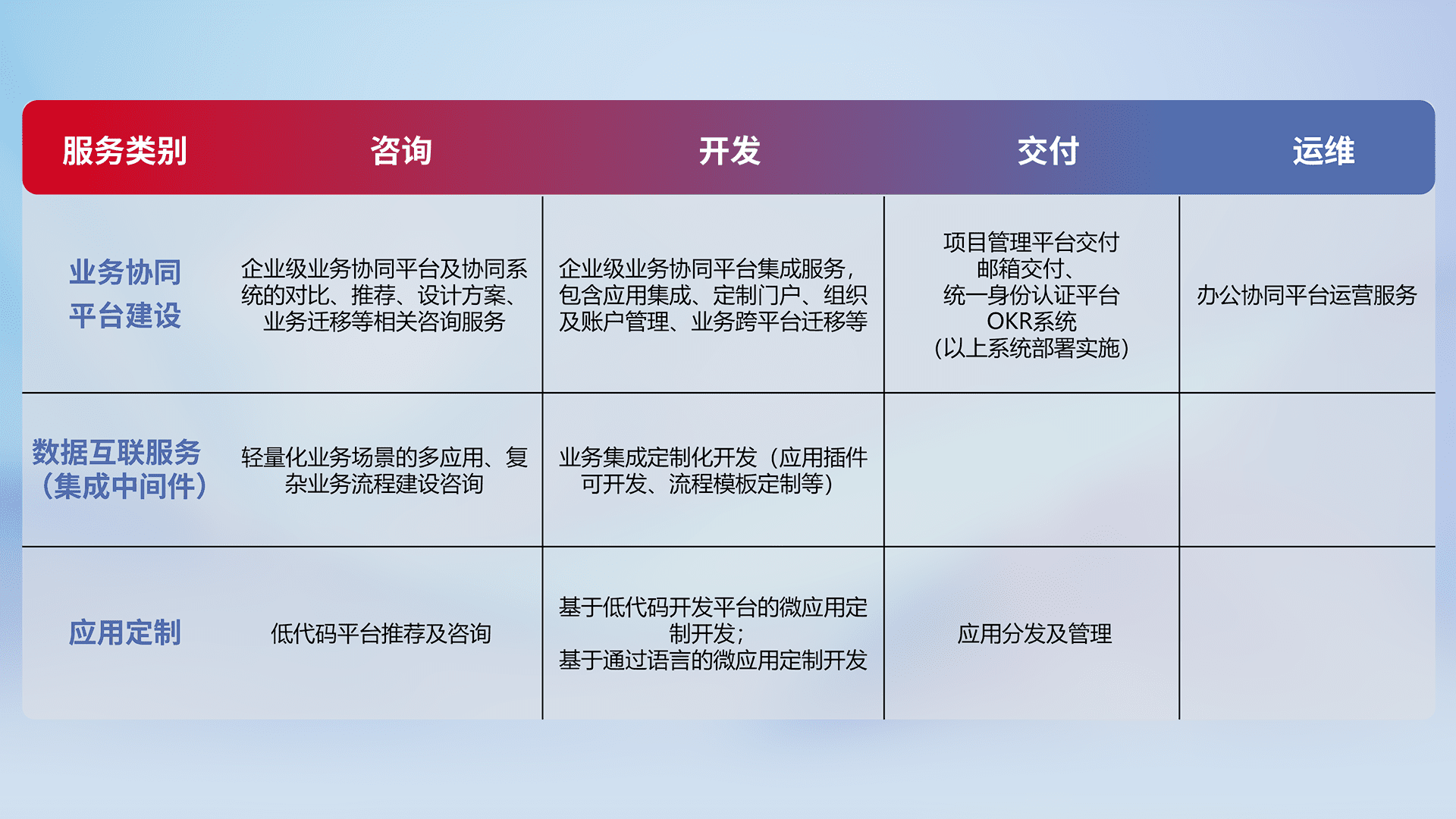 针对钉钉、、、企微、、、、IDaas等平台级产品提供产品的规划、、、、方案、、、、交付、、、、定制化开发等服务,,实现如统一协同办公、、、、智能客户服务、、混合会议管理、、智能数据查询、、、、等业务场景,,,,实现数字化转型。。。。